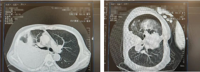 患者为男性,日前出现胸背部疼痛,并呈进行性加重,被家人紧急送至我院。患者有高血压等病史,考虑存在肋间神经痛,收治神经内科二病区。胸部CT检查结果显示:右侧大量胸腔积液并右肺实变、不张,医护人员迅速予以胸膜腔穿刺引流,引流出大量血性胸水。根据相关检查结果,不排除肿瘤。