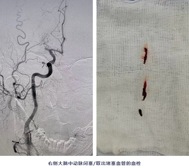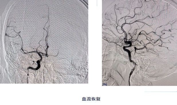 患者入院后,急诊检查初步判断脑卒中,卒中绿色通道立即开通,完善头颅CT排除脑出血,考虑缺血性脑卒中。脑科病院王建强院长团队立即给予静脉溶栓,但症状无明显缓解,核磁评估脑血管,提示右侧大脑中动脉闭塞。医护团队与患者家属充分沟通并取得同意后,立即联系介入手术室,行大脑中动脉闭塞血管再通术,成功开通责任血管,从穿刺到取出血栓,仅用时8分钟。