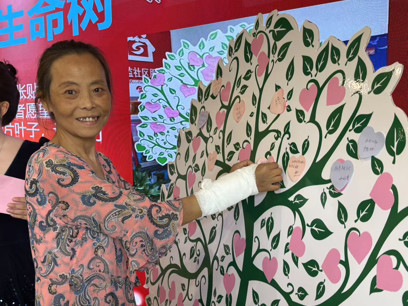舞台中央的心愿树,成为一道亮丽的风景,大家在爱心便利贴上写下心愿,“愿所有透析病人都不再难受”“希望自己少‘涨水’”“祝家人健康平安,医护人员工作顺利”……美好的祝福在无声中传递,整棵心愿树恍若有了生命,每片叶子似乎都在述说:纵使命运以痛吻我,也要报之以歌……