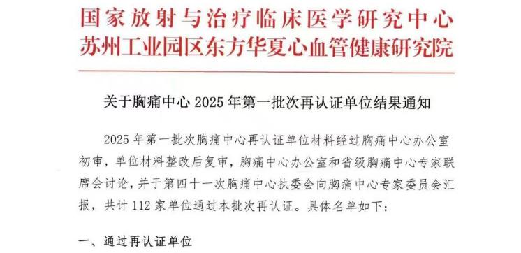 好消息!日前,国家胸痛中心2025年第一批次再认证结果公布,我院胸痛中心凭借卓越的综合实力、高效的救治体系和优质的医疗服务,顺利通过复审。