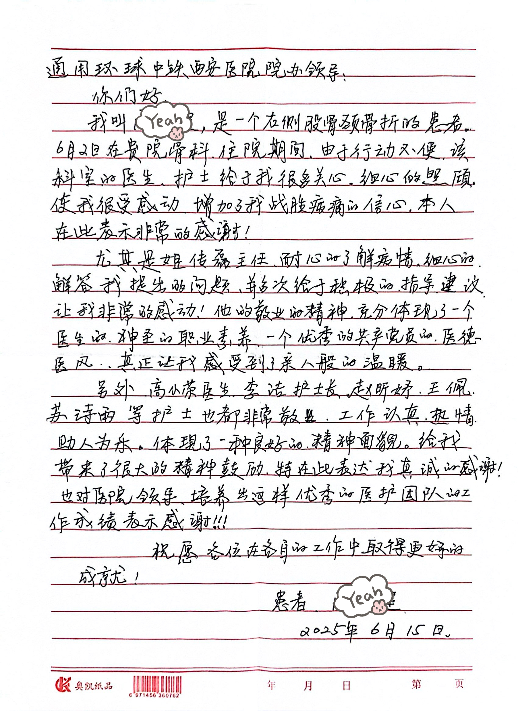 一封手写感谢信,无声诉说着沉甸甸的医患真情,更是对我院践行“仁爱关怀”服务理念的有力体现和生动注脚。服务患者之路永远没有终点,我院医护人员将继续以关爱为基,以专业为翼,用更加优质的医疗护理服务,传递医患情谊,守护生命健康!