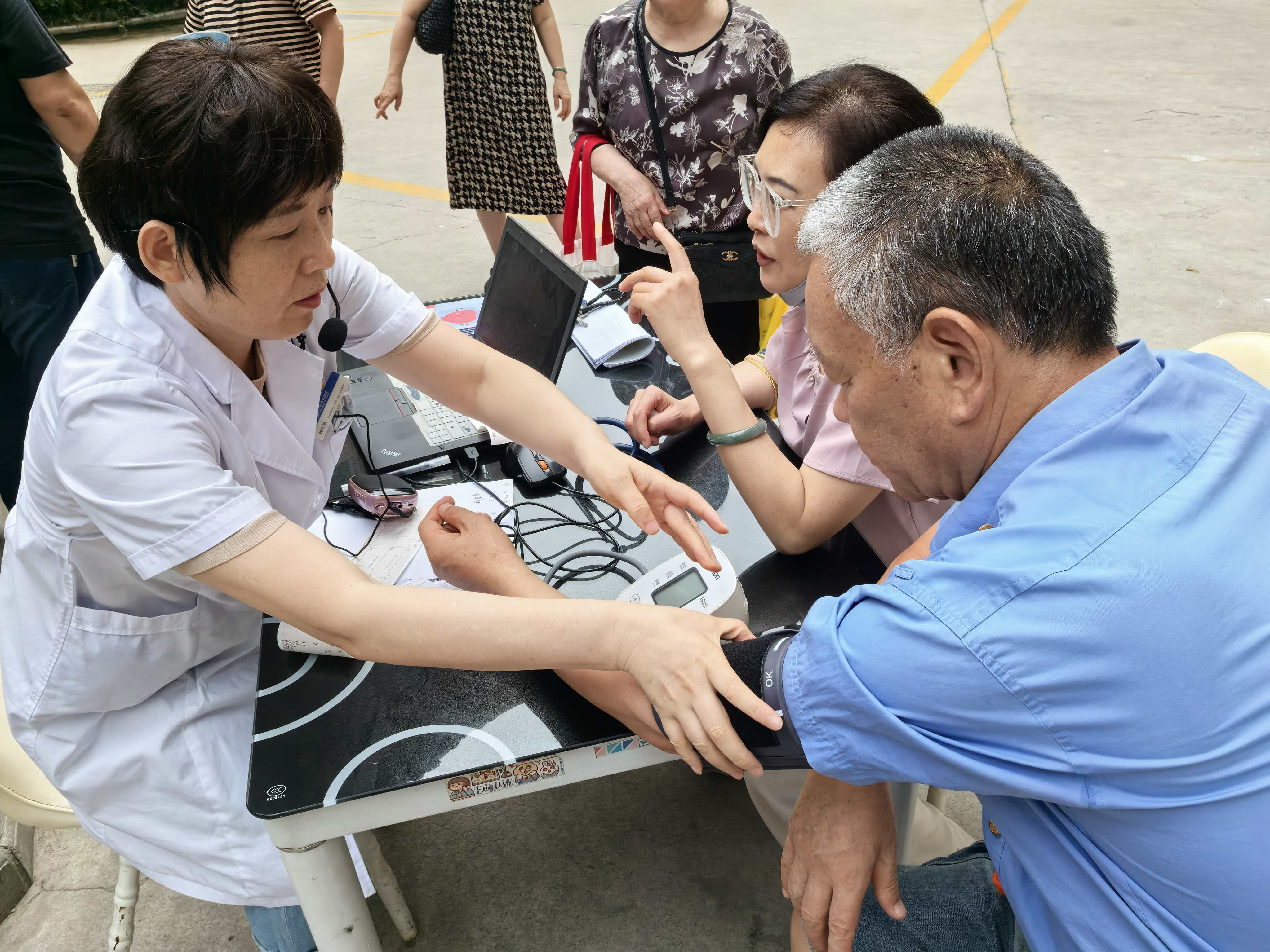 此外,我院医护团队还搭起简易工作台,为居民们提供多项健康服务。在心电图检测区前,医生护士耐心地为每位老人连接导联线,开展心电监测,记录心脏电活动。“阿姨,您早上吃东西了吗?测血糖需要空腹。”旁边的血糖检测点同样忙碌,护士细心地询问前来检测的老人,受到了广泛赞誉。