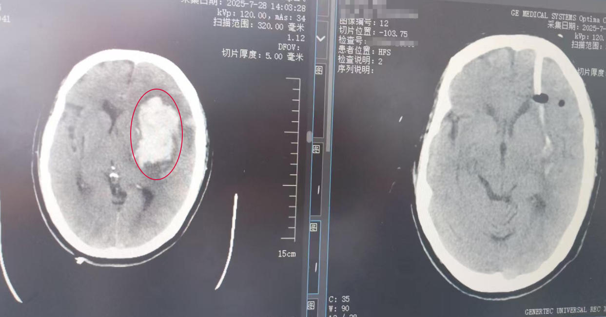 患者为女性,55岁,7月28日中午,她在家突发右侧肢体活动不灵,伴失语、意识不清、小便失禁,被邻居拨打120送至我院。急诊完善相关检查,发现左颞叶、左额叶可见脑实质出血,颅内出血总体积69.3ml,诊断为左侧基底节出血、左侧额颞叶出血、闭合性颅脑损伤特重型,收治入院。入院后,患者意识呈嗜睡状,言语含糊不流利。