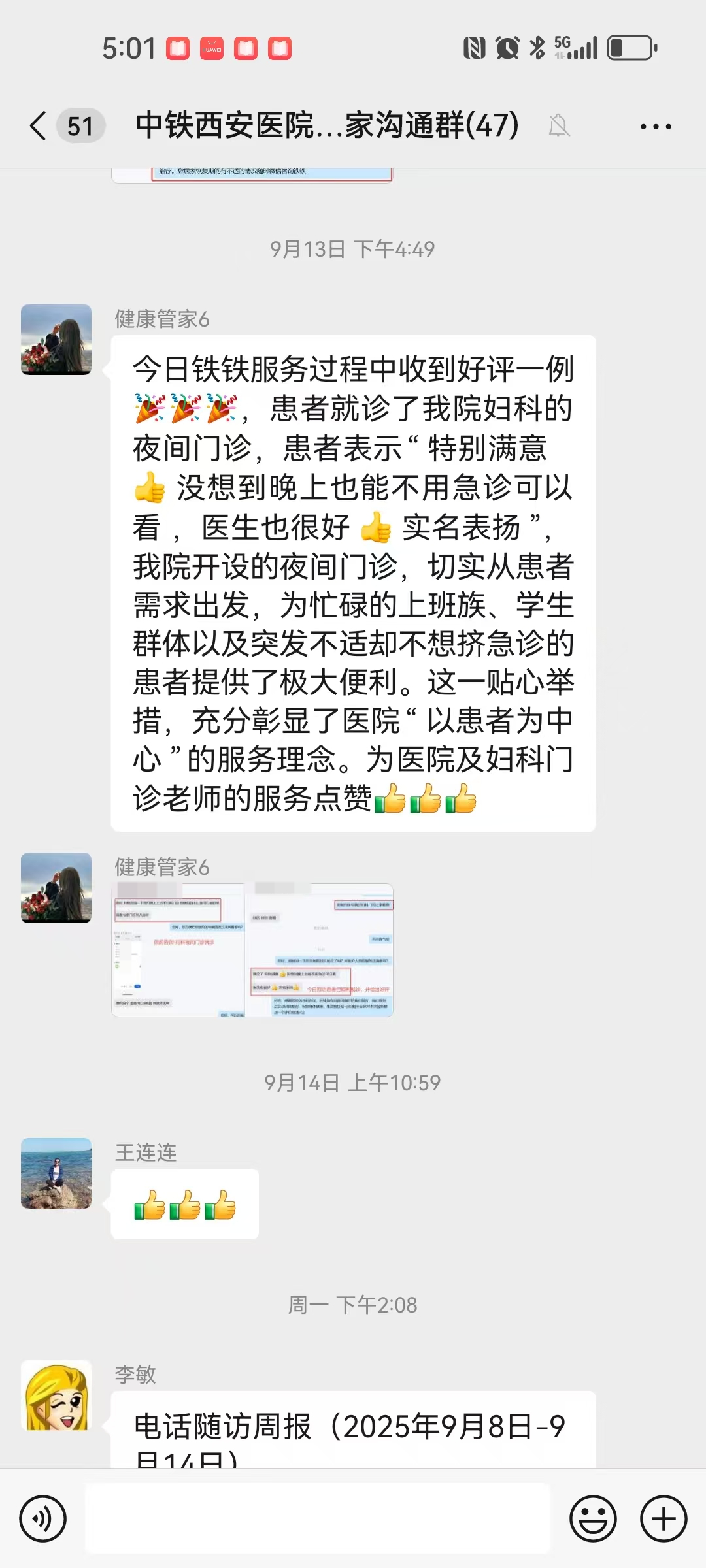 9月13日,我院对张女士就诊情况进行随访,其对夜间门诊服务和薛婀娜医生进行了表扬。