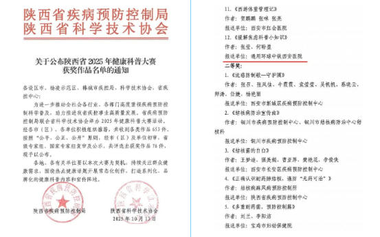 日前,由陕西省疾病预防控制局、省科学技术协会联合举办陕西省2025年健康科普大赛圆满结束,我院报送作品《缓解焦虑科普小知识》脱颖而出,荣获音视频类一等奖。