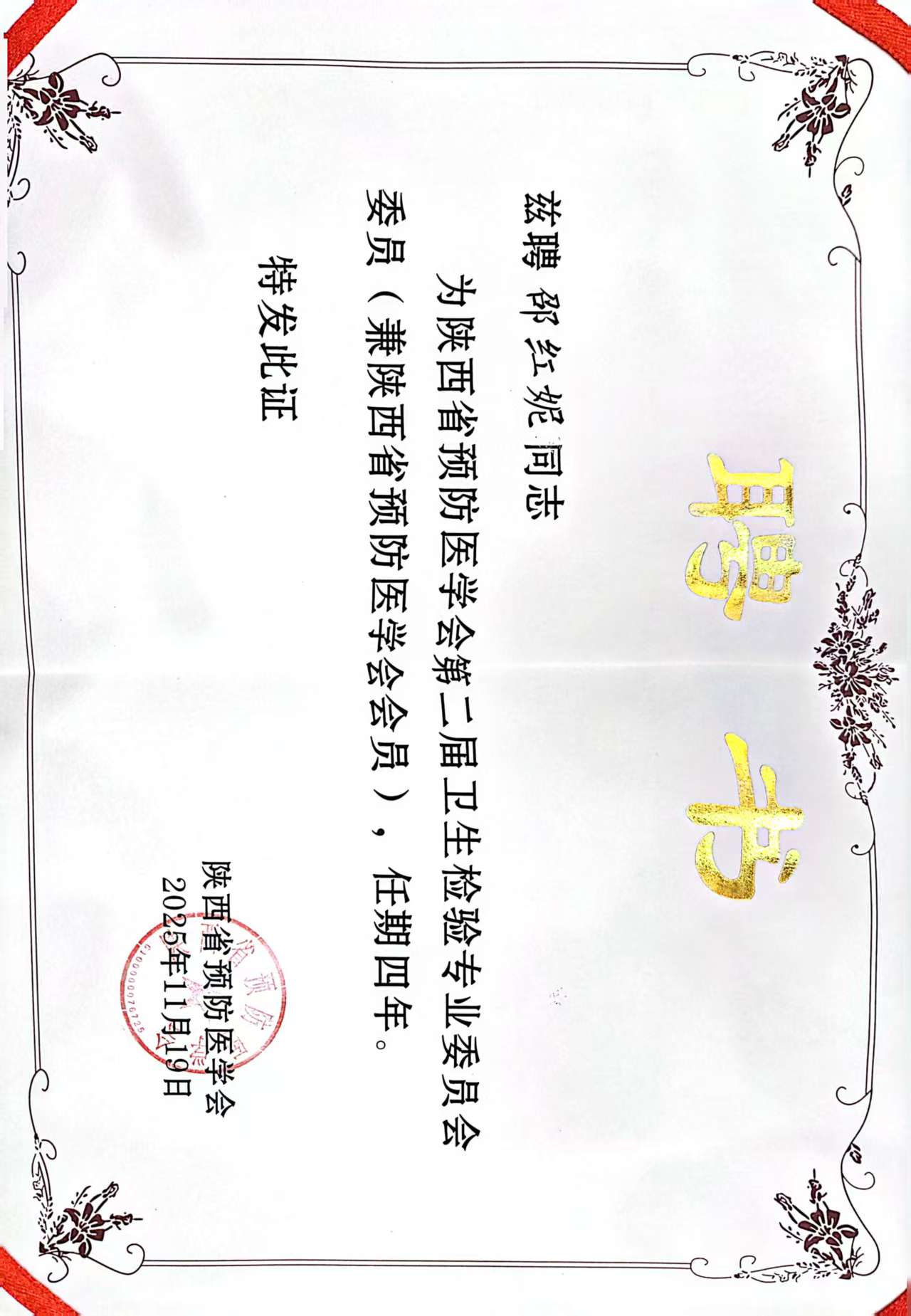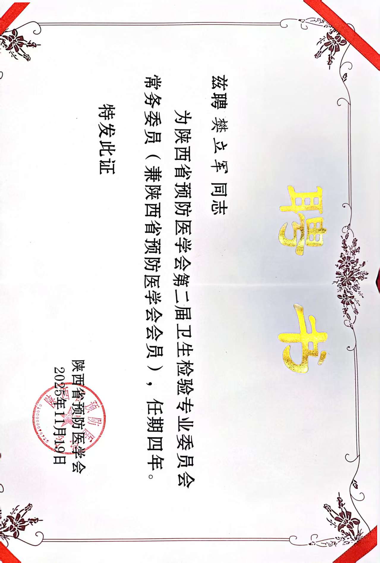 11月19日,陕西省预防医学会第二届卫生检验专业委员会换届大会暨学术年会在西安召开,大会完成了专业委员会新一届领导机构及委员的选举工作。其中,我院职业卫生科副主任技师樊立军凭借深厚的专业积淀与行业影响力,当选为委员会常务委员;职业卫生科主管技师邵红妮以扎实的技术能力与实践经验,当选为委员会委员。