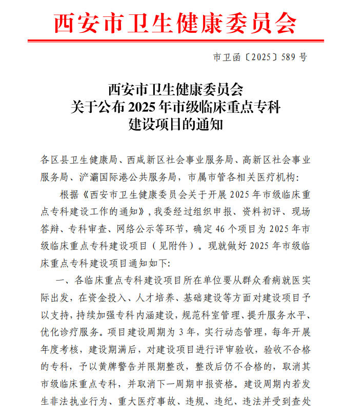11月18日,西安市卫生健康委正式公布《2025年市级临床重点专科建设项目名单》,我院护理专业经过严格的资料初评、现场答辩、专科审查与网络公示,凭借扎实的学科基础、鲜明的专业特色和卓越的服务能力成功入选,标志着护理学科体系建设实现了新的历史性跨越。