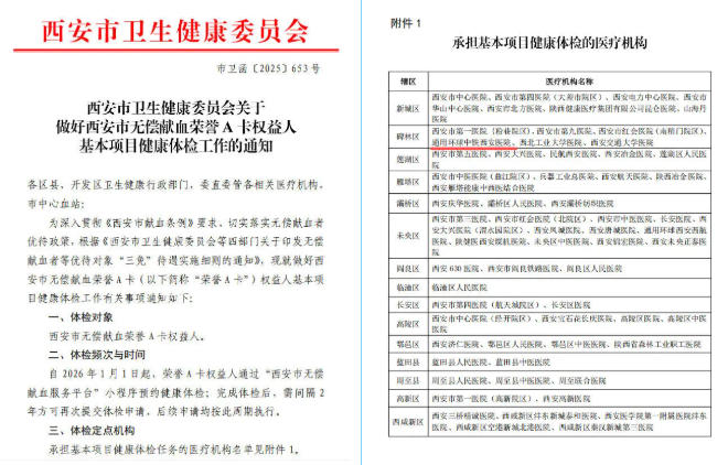 好消息!为贯彻落实《西安市献血条例》优待政策,根据相关文件精神,我院正式启动无偿献血荣誉证A卡持卡人免费体检工作,自今年1月1日起,符合条件的人员每两年可在我院享受一次基本项目免费健康体检。