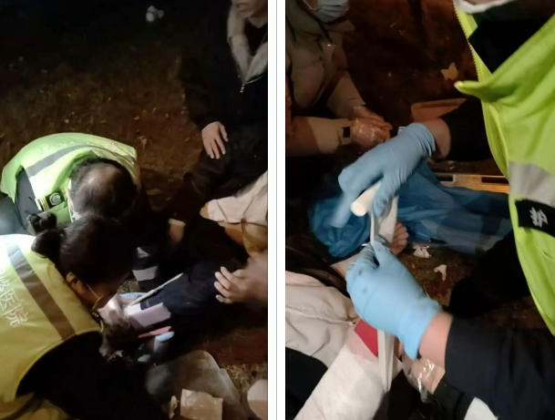 现场情况比预想的更为严峻。伤者22岁,意识尚清,但声音虚弱,手腕肿胀变形,左下肢胫腓骨断裂外露,出血较多。医护团队予以专业包扎和夹板固定后,小心翼翼地将其搬运上救护车。护士迅速建立静脉通路,进行心电监护、给予抗休克药物,监测生命体征。