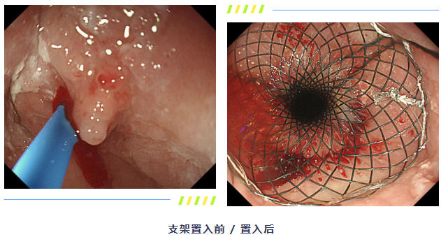 张排旗团队经过充分评估,制定了科学的手术方案及应急预案,并于2月下旬在介入手术室开展内镜下食管支架置入术。手麻科医生严密监测老人生命体征,并及时调整用药;术中可见肿瘤严重挤压食管,张排旗团队运用ERCP插管术,娴熟操控导丝顺利穿过狭窄段,随后,覆膜支架被精准输送到预定位置并成功释放,当支架完全张开,原本闭塞的食管瞬间被撑开,一条新的“通道”宣告建成!