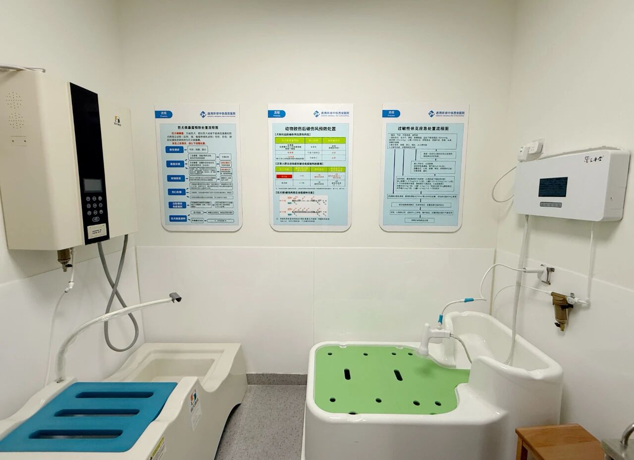 我院动物致伤门诊设施齐全,内设诊疗室、冲洗室、处置室、接种室、留观区,配备有先进的专用冲洗机等医疗设施和医护人员,提供专业犬伤处置、伤口冲洗、疫苗接种等服务,为周边居民提供专业化的狂犬病暴露处置解决方案。显著特点如下: