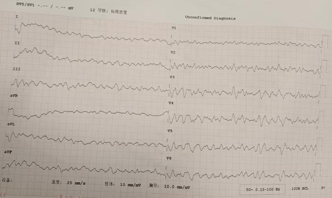 患者男性,36岁,有高血压病史、吸烟史,近期反复出现胸骨后疼痛,当晚,患者在大雁塔附近突发心跳骤停,倒地不起,家属急拨120,就近送入我院治疗。院前心电图提示前壁心肌梗死,心电监护显示反复室速,心血管病院院长张龙快速赶到急诊科,联合急诊实施心肺复苏抢救,经反复除颤、胸外按压及使用药物后,患者恢复自主心率,但仍不稳定。团队充分评估后,决定先给予溶栓治疗,为后续抢救争取时间。