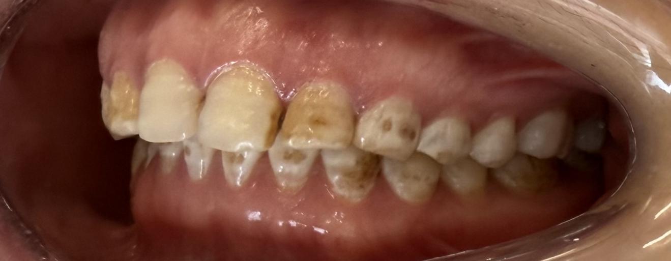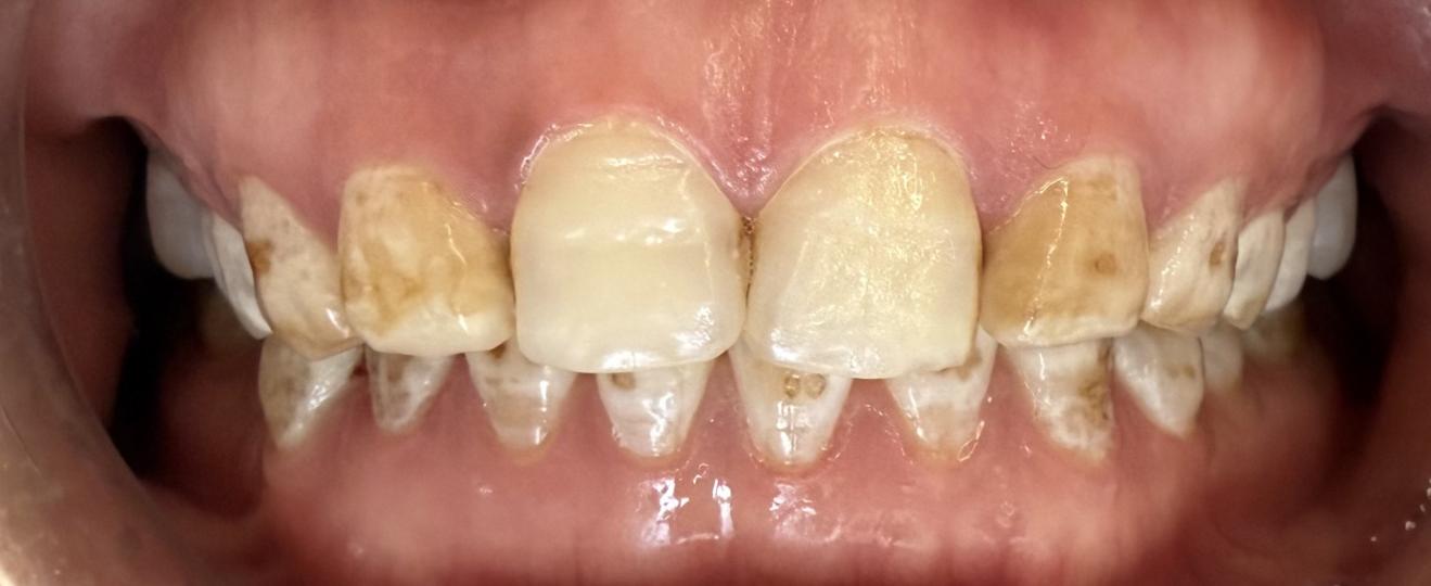 党秀医生接诊,为她进行了全面的口腔检查和美学评估。患者牙齿牙面呈深黄色斑块状,唇侧釉质多处片状缺损,边缘粗糙,部分区域浅层牙本质暴露,进冷热食物时常有不适。其余牙齿也存在不同程度的色素沉着,整体颜色晦暗。结合病史及临床检查,诊断为重度氟斑牙伴牙釉质缺损。