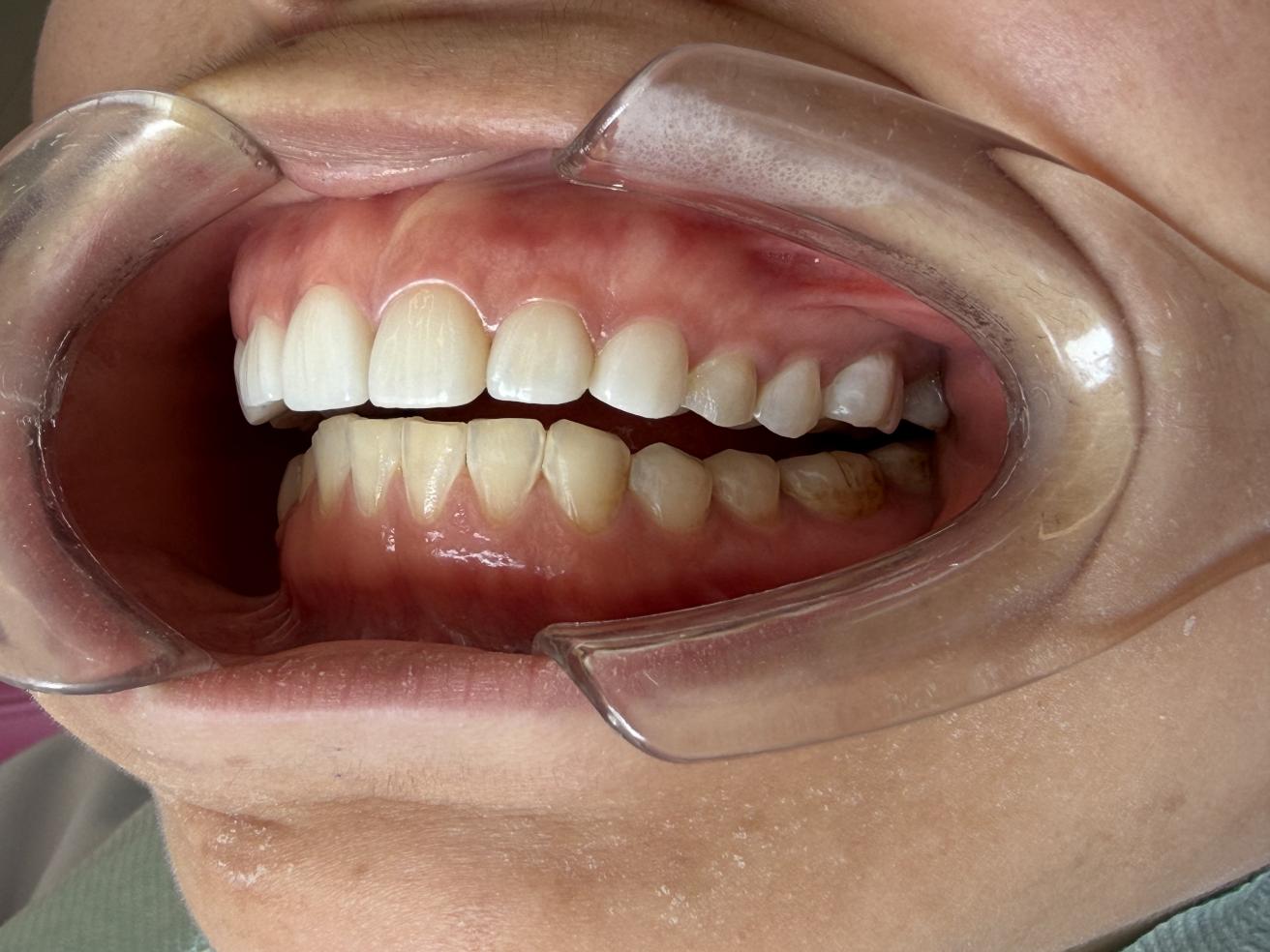 针对患者“既要恢复功能,又要美观自然”的诉求,党秀定制了“全口牙齿美白+美学修复”的诊疗方案。首先,对全口牙齿进行渗透树脂美白,将基础牙齿色调提亮2-3个色阶,使其他牙齿与后续贴面修复后的上前牙颜色协调;其次,开展上前牙贴面美学修复,制作超薄瓷贴面,恢复牙体外形、遮色并重建缺损的釉质层。全程治疗周期约10天,患者无明显不适。