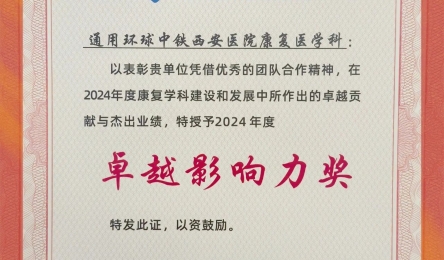 日前,我院康复医学科被通用技术环球医疗康复医学专业委员会授予2024年度卓越影响力奖,这是科室卓越的专业能力、创新的治疗理念以及优秀团队合作精神的生动体现